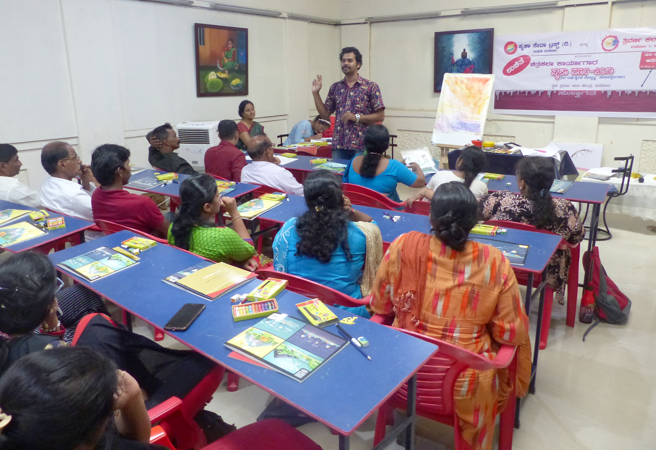 ಪ್ರಷಾ ಸೇವಾ ಟ್ರಸ್ಟ್ ಉಡುಪಿ - ಮಣಿಪಾಲ ಹಾಗೂ ತ್ರಿವರ್ಣ ಕಲಾಕೇಂದ್ರದ ಸಹಯೋಗದಲ್ಲಿ 20-10-2019 ರಂದು ಕಲಾಕೇಂದ್ರದಲ್ಲಿ 3೦ವರ್ಷಕ್ಕಿಂತ ಮೇಲ್ಪಟ್ಟ ಕಲ್ಲಾಸಕ್ತರಿಗಾಗಿ ಆಯೋಜಿಸಿದ್ದ ಉಚಿತ ಚಿತ್ರಕಲಾ ಕಾರ್ಯಾಗಾರವನ್ನು ಉದ್ಘಾಟಿಸಿ ಮಾತನಾಡಿದರು