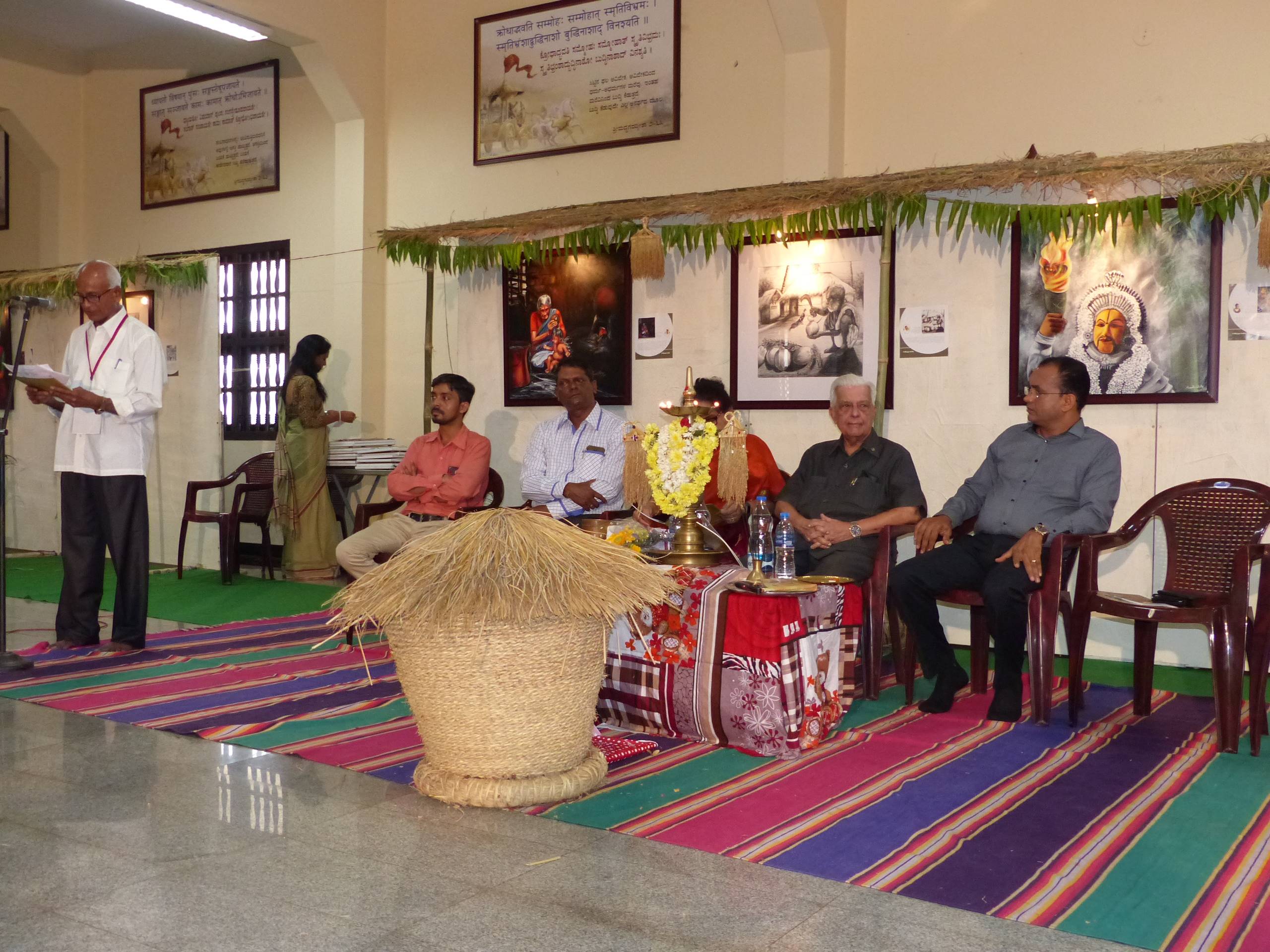 Twenty four senior batch artists from Kundapur and Manipal, from age group 19 to 75 years spent over 2 weeks to develop various arts related to village life. Artwork from artists of various types included in this exhibition was Acrylic Painting on canvas and Charcoal paintings. Paintings included Akki Mudi(storage madeup of rice straw and hay), Kanaja(paddy storage structure), Abhyanga(grandma giving oil bath to a baby), Bhoota kola worship, Study under Chimini Deepa(lantern), ancient games like lagori, buguri, bandi(roll), Channamane (Alagulimane) and many more. Over thousand public people visited the exhibition venue each day and applauded the idea, effort and imagination of artists.