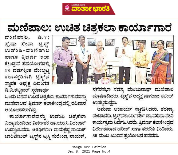 ಪ್ರಷಾ ಸೇವಾ ಟ್ರಸ್ಟ್ ಉಡುಪಿ - ಮಣಿಪಾಲ ಹಾಗೂ ತ್ರಿವರ್ಣ ಕಲಾಕೇಂದ್ರದ ಸಹಯೋಗದಲ್ಲಿ 05-12-2021 ರಂದು ತ್ರಿವರ್ಣ ಕಲಾಕೇಂದ್ರದಲ್ಲಿ 18ವರ್ಷಕ್ಕಿಂತ ಮೇಲ್ಪಟ್ಟ ಕಲಾಸಕ್ತರಿಗಾಗಿ ಪ್ರಶಾ ಸೇವಾ ಟ್ರಸ್ಟ್ ನ ಸ್ಥಾಪಕ ಅಧ್ಯಕ್ಷ ದಿವಂಗತ ಡಿ. ವಿ. ಶೆಟ್ಟಿಗಾರ್ ಸ್ಮರಣಾರ್ಥ ಆಯೋಜಿಸಿದ್ದ ಉಚಿತ ಒಂದು ದಿನದ ಚಿತ್ರಕಲಾ ಕಾರ್ಯಾಗಾರವನ್ನು ಡಾ। ಯು ಸಿ ನಿರಂಜನ್, ನಿರ್ದೇಶಕರು ಚಿತ್ರಕಲಾ ವಿದ್ಯಾಮಂದಿರ, ಉಡುಪಿ ಉದ್ಘಾಟಿಸಿ, ಸೃಜನಶೀಲತೆ ಮತ್ತು ಏಕಾಗ್ರತೆಯನ್ನು ಉದ್ದೀಪನಗೊಳ್ಳಲು, ಹಾಗೂ ಬದುಕನ್ನು ಅರಿತು ಜೀವನೋತ್ಸಾಹ ಬೆಳೆಸಲು ಚಿತ್ರಕಲೆ ಸಹಕಾರಿಯಾಗಿತ್ತದೆ ಎಂದು ಉದ್ಘಾಟನಾ ಭಾಷಣದಲ್ಲಿ ಹೇಳಿದರು. ಗೌರವಾನ್ವಿತ ಅತಿಥಿಗಳಾದ ಸುರೇಂದ್ರ ನಾಯಕ್, ಟ್ರಸ್ಟೀ, ರಾಮಕೃಷ್ಣ ನಾಯಕ್ ಚಾರಿಟೇಬಲ್ ಟ್ರಸ್ಟ್, ಹಾಗೂ ಮಂಜುನಾಥ್ ಮಣಿಪಾಲ, ಮುನ್ಸಿಪಾಲ್ ಕೌನ್ಸಿಲರ್ , ಉಡುಪಿ, ಇವರು ಮಾತನಾಡಿ ಶಿಭಿರಾರ್ಥಿಗಳನ್ನು ಚಿತ್ರಕಲೆಯಲ್ಲಿ ತೊಡಗಿಸಿಕೊಳ್ಳಲು ಹುರಿದುಂಬಿಸಿದರು.