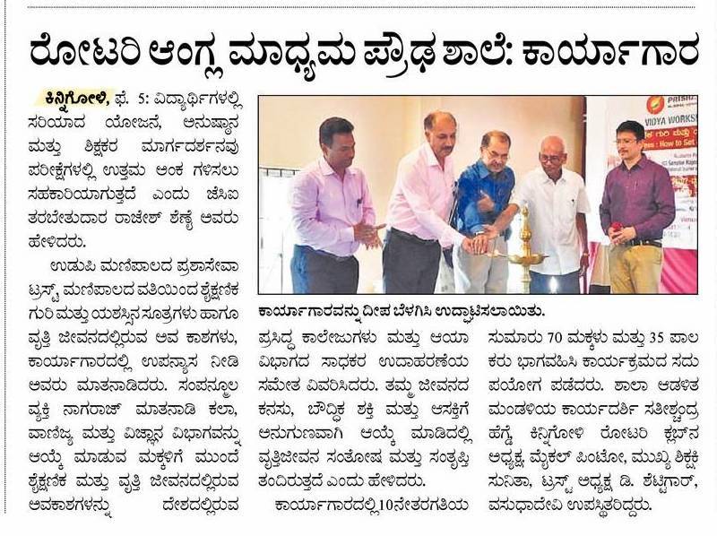Secretary of school management committee Rot. Sathishchandra Hegde, President of Rotary Club Kinnigoly Rot. Michal Pinto, School Headmistress Sunitha G, President of the Trust D V Shettigar, Treasurer Vasudha Devi and Secretary Nagaraj Kateel were present on this occasion. Secretary of school Sathishchandra Hegde in his concluding remarks opined that such workshops are essential for the students of rural area and gives a better exposure to students both in terms of studies and career options. About 70 students of the school and 30 parents were the beneficiaries of these workshops. Headmistress Sunitha welcomed the gathering. The program commenced with a short prayer from students and was inaugurated by lighting the lamp by distinguished guests.
