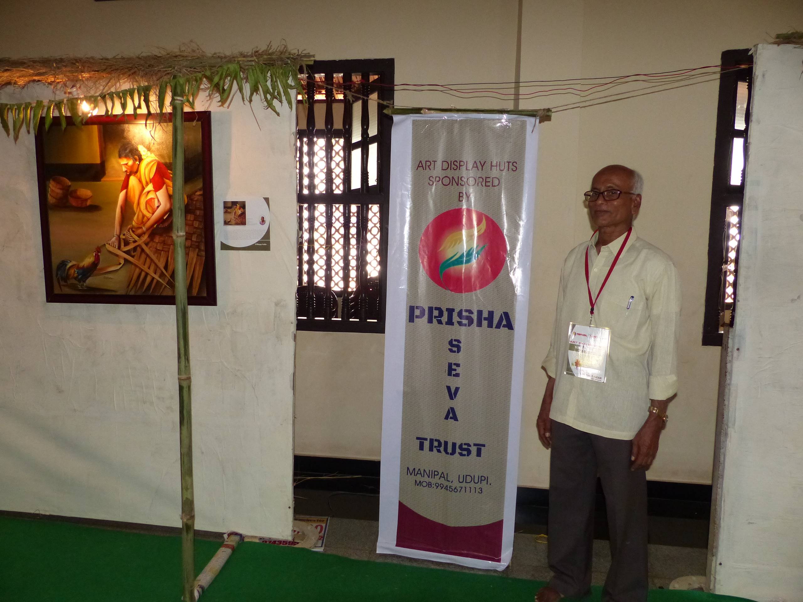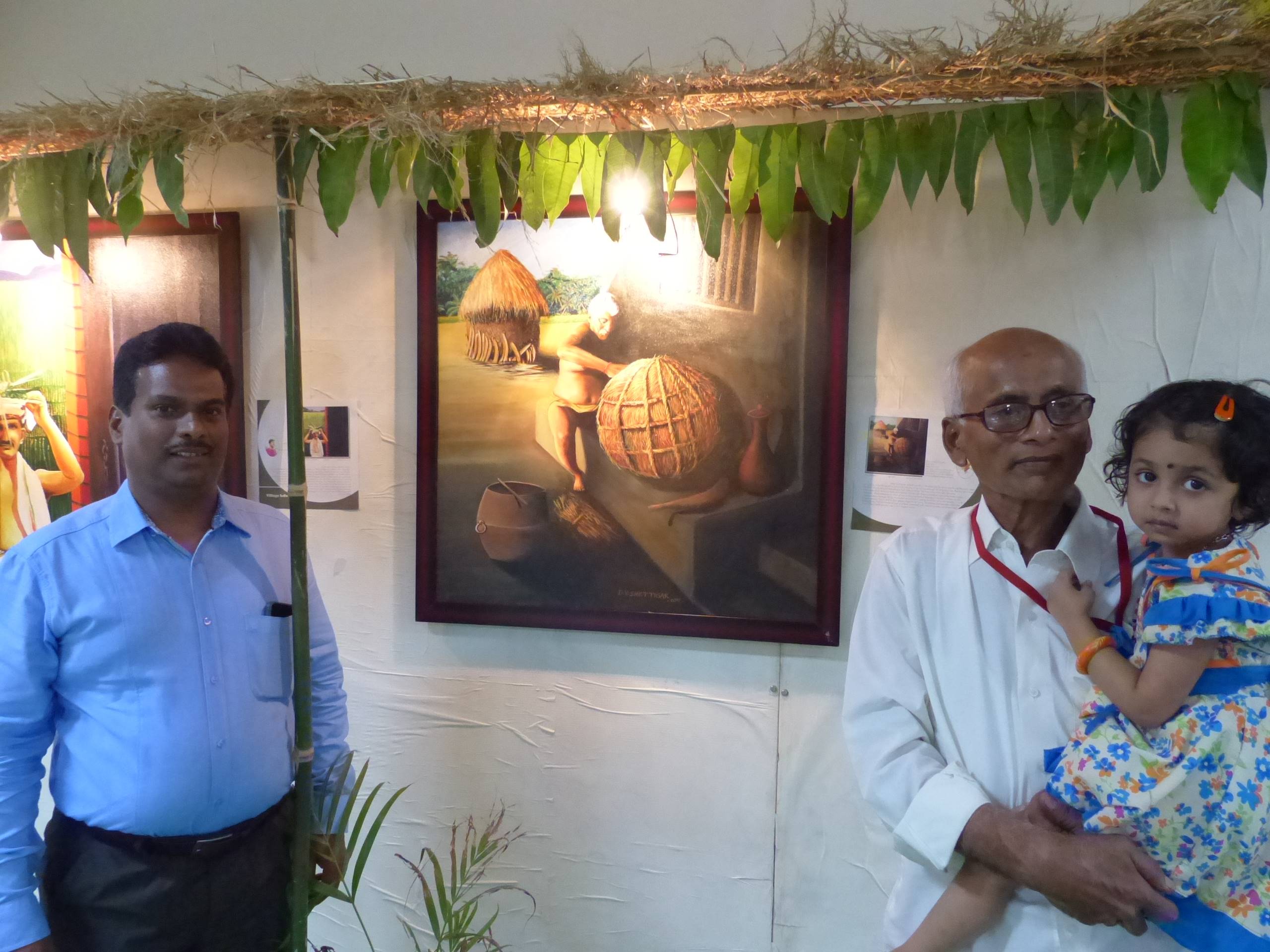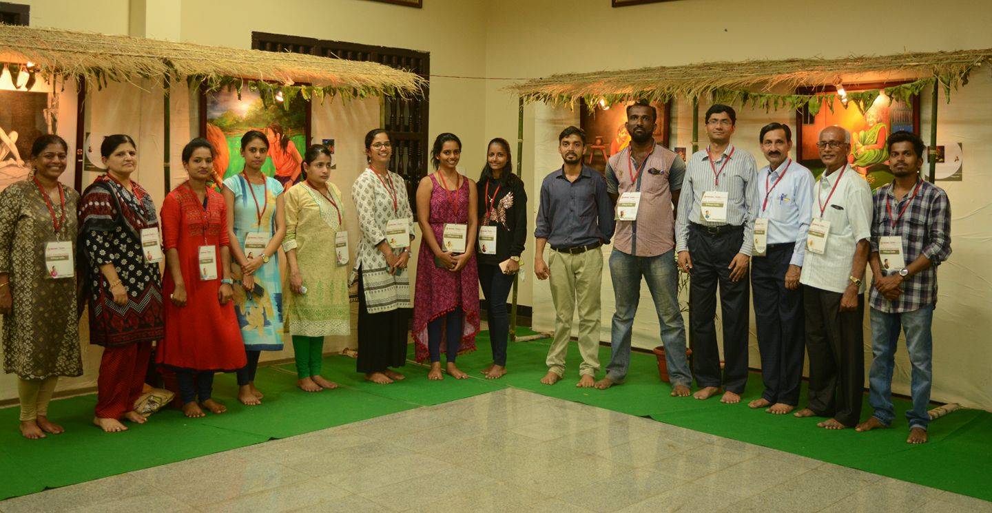 Twenty four senior batch artists from Kundapur and Manipal, from age group 19 to 75 years spent over 2 weeks to develop various arts related to village life. Artwork from artists of various types included in this exhibition was Acrylic Painting on canvas and Charcoal paintings. Paintings included Akki Mudi(storage madeup of rice straw and hay), Kanaja(paddy storage structure), Abhyanga(grandma giving oil bath to a baby), Bhoota kola worship, Study under Chimini Deepa(lantern), ancient games like lagori, buguri, bandi(roll), Channamane (Alagulimane) and many more. Over thousand public people visited the exhibition venue each day and applauded the idea, effort and imagination of artists.