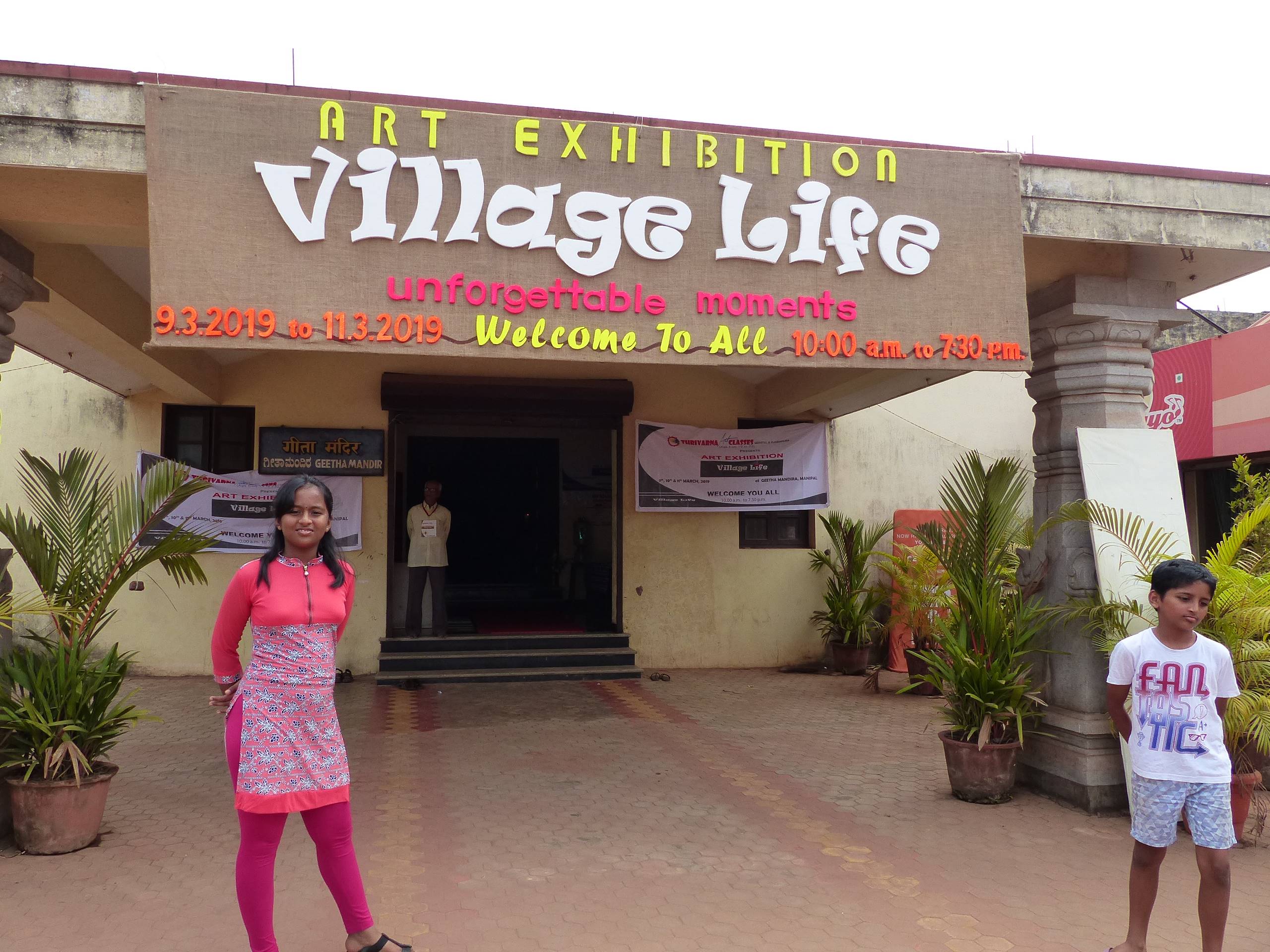 Trivarna Arts Center, Manipal has organized arts training and exhibition for students along the themes of Village Life. Exhibition was held on March 9th to 11th 2019 at Geetha Madnir, Manipal. Highlight of the exhibition was that the Paintings and artwork were displayed in a village life environment. In Geetha Mandir, huts with paddy grass(dried hay) ceiling supported by bamboo poles and decorated by mango leaves arcs, lanterns, vegetables and various village life objects was the setup for exhibiting the paintings.